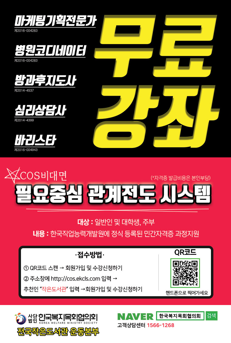 어느 교회나 관계자가 신청가능(cos.ekcls.com/ www.kwccc.co.kr/ 1566-1268)하고, 교회는 지역주민 누구나 초청해서 회원가입만 하면 70여 가지의 필요중심 관계전도의 다양한 민간자격과정 강의를 무상으로 이용할 수 있다.
